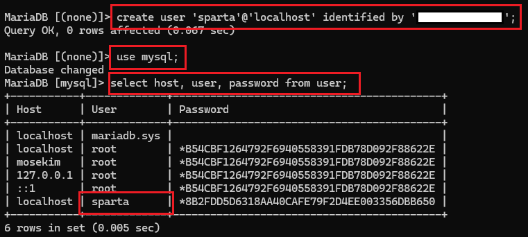 - SELECT host, user, password FROM user ์ ๋ ฅ (โป ์์ฑ๋ ์ฌ์ฉ์ ํ์ธ)