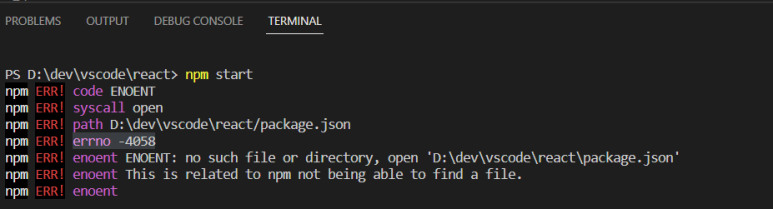 npm start ๋ช ๋ น์ด๋ฅผ ์ํ ์, package.json ์ ์ฐพ์ ์ ์๋ค๋ ์๋ฌ