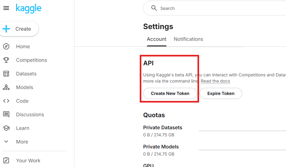 1 . ํ๋กํ ํด๋ฆญ → API ํญ๋ชฉ 'Create New Token' ํด๋ฆญ → kaggle.json ๋ค์ด๋ก๋