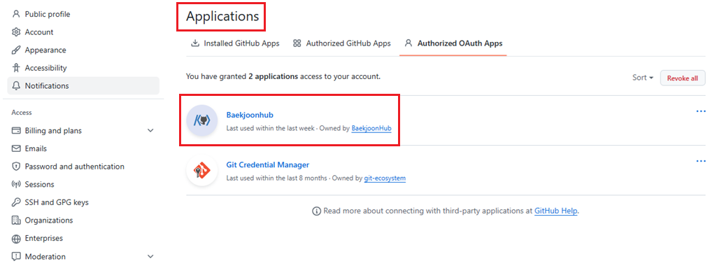 2. Settings > Applications > Authorized OAuth Apps ์์ ๋ฐฑ์ค ํ๋ธ ์ฑ ์ฐ๊ฒฐ ํด์ (remoke)