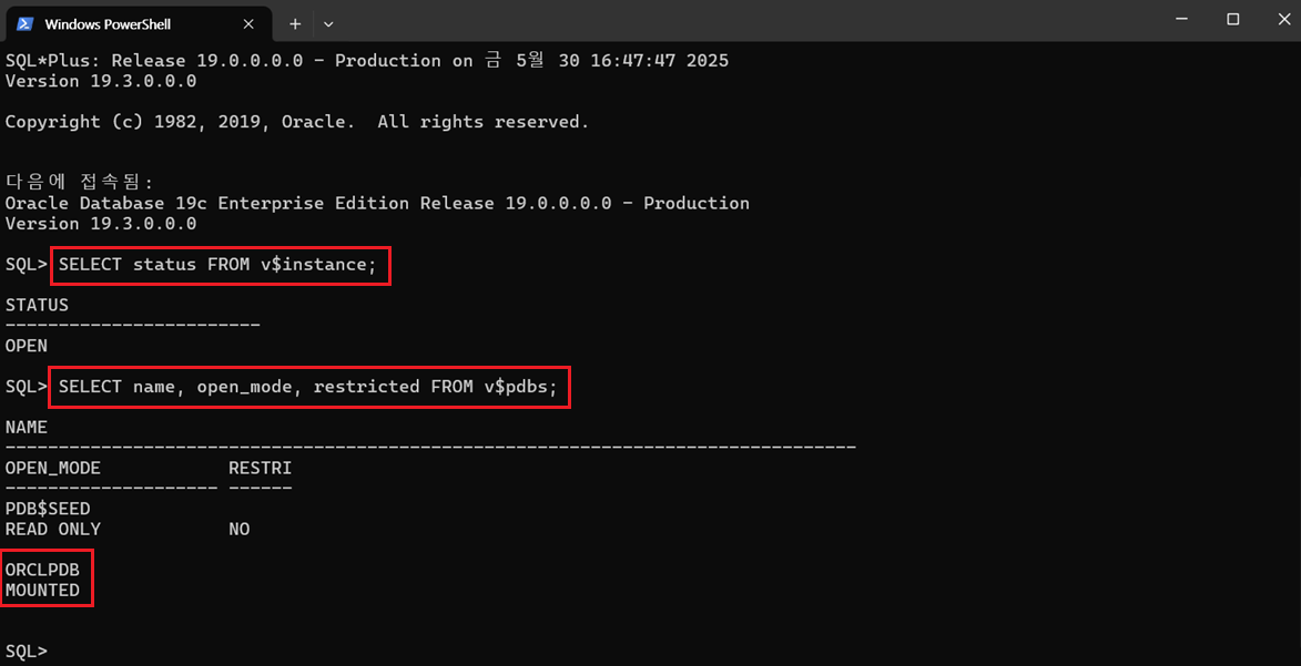 βοΈ (PDB) μν μ‘°ν (ORCLPDB - MOUNT μν)